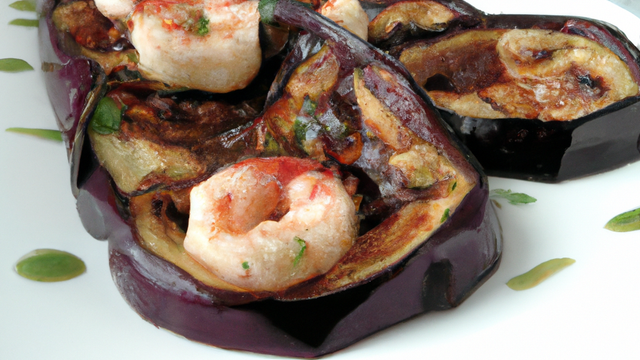 Entrée simple de petites lamelles d'aubergines grillées fourrées d'un scampi.