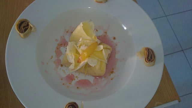 Vous pouvez également préparer une crêpe roulée au chocolat pour la décoration et pour les plus gourmands. Coupez les en rondelle et les disposer aux quatre coins de l'assiette.
