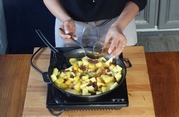 Mettez également le bâton de cannelle, la badiane, les raisins secs puis laissez cuire une dizaine de minutes.