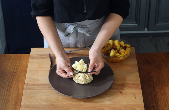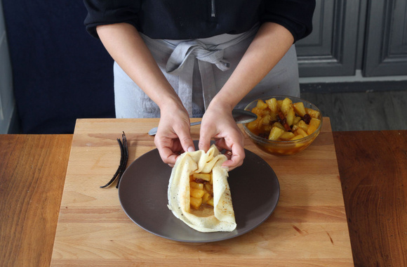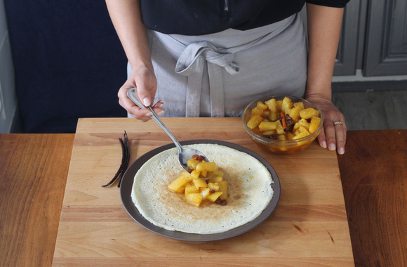Mettez un peu de mélange d'ananas aux épices au centre d’une crêpe.