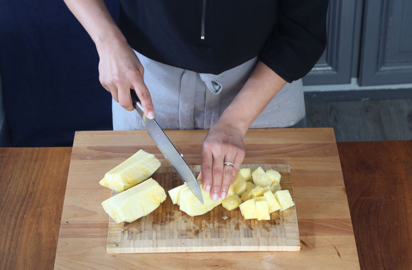Épluchez un ananas, coupez–le en deux dans le sens de la longueur, puis découpez chaque moitié de nouveau dans le sens de la longueur. Retirez le cœur de l’ananas et coupez le reste en morceaux.