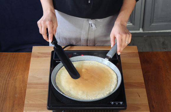 Versez une louche de pâte, attendez que les bords de la crêpe colorent, puis décollez-la à l'aide d'une spatule. Une fois qu'elle se détache bien, retournez la crêpe et faites-la cuire de l'autre coté encore 1 minute environ.