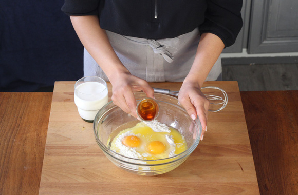 Mélangez le beurre fondu au lait et versez l'appareil dans le saladier tout en mélangeant énergiquement.