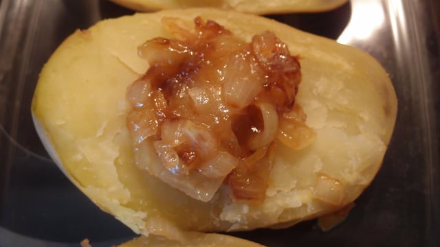 En période de carnaval, n'hésitez pas à déguiser votre assiette. Cette recette consiste à une grosse pomme de terre farcie de bœuf haché cuit avec un coulis de tomates, le tout surmonté d'un confit aux oignons.