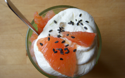 Terminez en déposant un nuage de fromage frais à l'aide d'une poche à douille. Décorez de quelques graines de sésame noir pour l'effet grahique et le croquant, puis piquez 2 petits morceaux de pamplemousse rose.