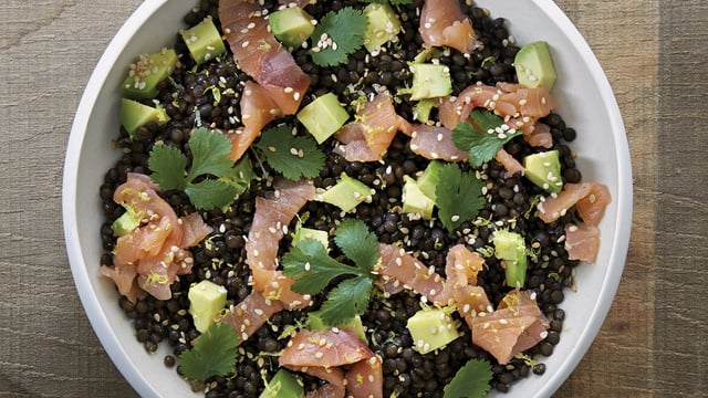 Une fois les lentilles légèrement refroidies, assaisonnez-les avec la sauce vinaigrette. Disposez dans des assiettes creuses, répartissez les cubes d’avocat, des lamelles de saumon fumé, parsemez de coriandre fraîchement ciselée et de graines de sésame torréfiées.