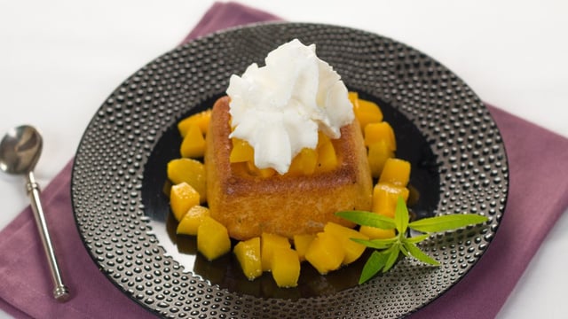 Servez les babas avec la chantilly et les dés de pêche.