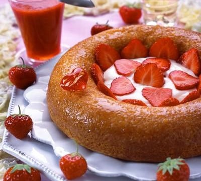 Fouetter la crème fraîche bien froide en chantilly en lui incorporant le sucre glace restant. Disposer le baba sur un plat, verser la crème chantilly au centre et décorer avec les fraises réservées, coupées en lamelles. Présenter le coulis à part. Servir frais sans attendre.