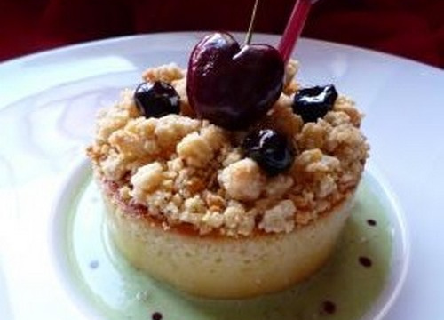 Décorez le dessus du crumble avec une pipette de coulis de cerise, et une cerise fraîche. Finalisez la décoration en déposant des petits points de coulis de cerise sur la crème anglaise. Dégustez sans tarder.