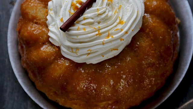 Mélangez la confiture d’oranges et la gelée de coings dans un petit bol, ajoutez une cuillère d’eau et faites chauffer au four à micro-ondes. A l’aide d’un pinceau, enduisez le baba pour qu’il soit plus brillant Versez la crème dans le bol du robot, ajoutez le sucre glace et à l’aide du fouet montez la crème en chantilly, elle doit être bien ferme. Versez la dans une poche à douille munie d’une douille cannelée et ajoutez la crème sur le dessus du baba. Réservez au frais.