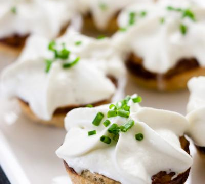 Lorsque la crème au roquefort est bien froide, versez la dans un siphon, mettez la cartouche et secouez 8 fois environ. Faites un test dans l'évier puis nappez vos baby tourtes ! Parsemez de ciboulette ciselée.