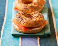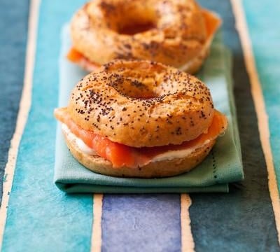 Laissez refroidir les bagels, coupez-les en deux et garnissez-les de crème fraîche et de saumon fumé.