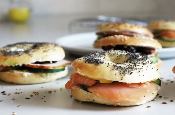 Bagel Saumon – Concombre – Pomme: Couper le pain bagel en deux. Les faire griller si besoin (pas si ils sont frais). Tartiner le bas et le haut du bagel de fromage frais. Poser quelques fines lamelles de concombre, une tranche de saumon fumé, quelques brins d’aneth, une tranche de pomme puis refermer. Bagel Poulet – Avocat – Moutarde au miel: Couper le pain bagel en deux. Tartiner le bas de fromage frais, le haut de moutarde au miel. Poser des lamelles d’avocat, une tranche de poulet, quelques canneberges séchés puis refermer.