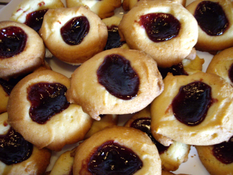 Sur une plaque farinée faire des petits tas, creuser en leur centre, avec le doigt, un enfoncement pour déposer de la confiture (gelée de préférence).