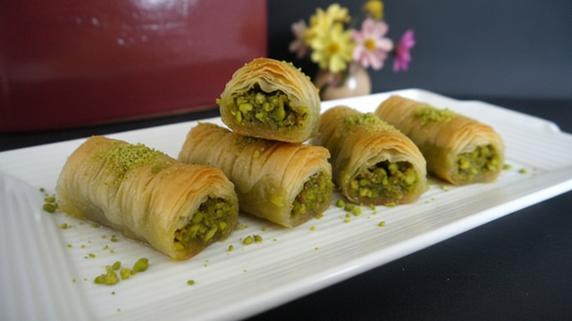 Déposer le rouleau plissé dans un plat allant au four. Continuer ainsi avec toutes les feuilles. Badigeonner les rouleaux de beurre fondu. Enfourner dans le four préchauffé à 180°C pendant environ 20 minutes. Découper les baklavas selon la taille désirée. Arroser avec le sirop refroidi et laisser refroidir quelques heures. Décorer de poudre de pistaches.