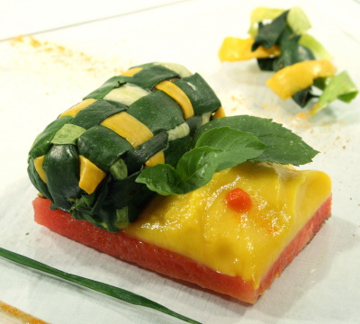 Détailler la pastèque en rectangle fin. Déposer dessus la purée jaune et le ballotin de saumon. Décorer de curry, basilic et menthe et d'une pointe de purée de piment rouge.