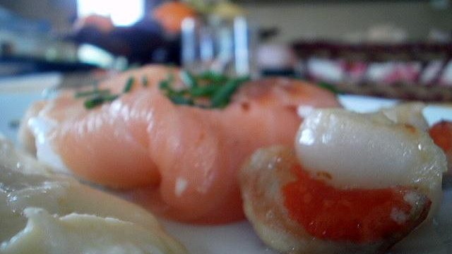 Mettre sur une petite assiette l'œuf au centre et le recouvrir d'une tranche de saumon fumé.