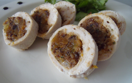 Sur un morceau de film étirable, étaler une escalope, la tartiner d'1cc de crème fraîche. Sur un bord (coté largeur) disposer la moitié de la farce puis rouler l'escalope sur elle même en s'aidant du film. Bien envelopper le "boudin" avec le film et fermer les extrémités. Faire de même avec l'autre escalope.
