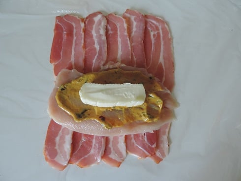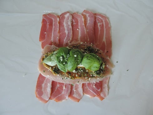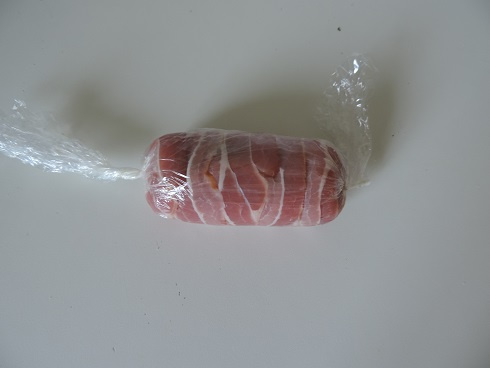 1Sur le plan de travail, étendre un film alimentaire et poser dessus les tranches de lard légèrement chevauchées. Poser dessus le filet de poulet.
