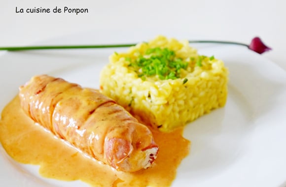 4Servir avec un risotto et une sauce moutarde. Risotto : Commencer la cuisson 5min avant de plonger les ballottines dans l'eau bouillante. Sauce: Dans un poêlon, faire chauffer 1dl de crème fraîche avec 1cs de moutarde douce jusqu'à épaississement.