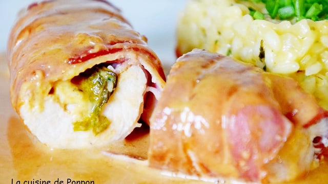 NB: Vous pouvez toujours un peu attendrir, aplatir le filet avant de le poser sur les tranches de lard. Le temps de cuisson de la ballottine dépend de la grosseur de cette dernière. Vous pouvez ajouter un peu de fromage de votre choix à la sauce, elle n'en sera que meilleure !