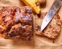 Cake à la banane à la farine de châtaigne, chocolat et noix caramélisées.