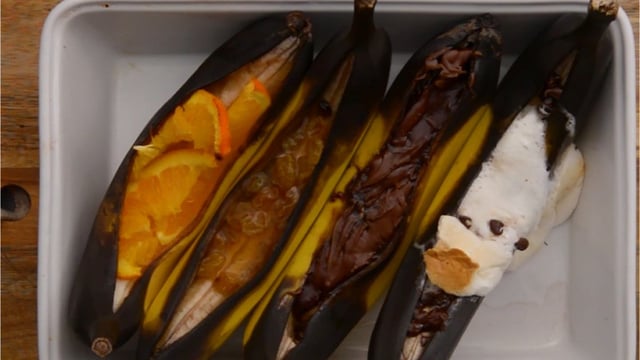Faire une incision dans le sens de la hauteur sur chaque banane et écarter légèrement la peau.