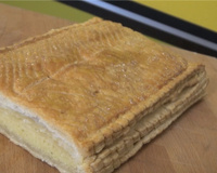 Farinez le plan de travail et abaissez la pâte avec un rouleau à pâtisserie, jusqu'à obtenir un rectangle puis déposez sur une plaque recouverte de papier sulfurisé et dorez les bords à l’œuf battu. Versez la crème dans la poche à douille et réalisez des bandes de crème au centre puis étalez la crème. Ajoutez la deuxième abaisse et ajoutez-la dessus la crème. Découpez la pâte si c'est trop grand, collez les bords et chiquetez. Dorez le dessus, piquez la pâte et striez le dessus avec la lame d'un couteau. Faites cuire à 180°C pendant 20 à 25 minutes. Facultatif : Réalisez un sirop avec du sucre canne et de l'eau pour imbiber le dessus de la tarte.