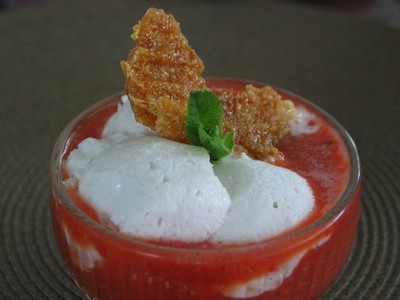 Chauffez doucement le lait de coco avec 90g de sucre. Incorporez lui les feuilles de gélatine ramollies à l'eau froide et essorées. Versez cette préparation dans un saladier placé dans de l'eau contenant des glaçons. Fouettez au batteur électrique à grande vitesse jusqu'à la consistance de blancs en neige, cette étape est un peu longue, pas loin de 10 mn... Réservez au frais 1 h.