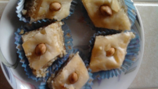 Coupez la baqulawa en forme de losange puis ajoutez une amande au milieu.