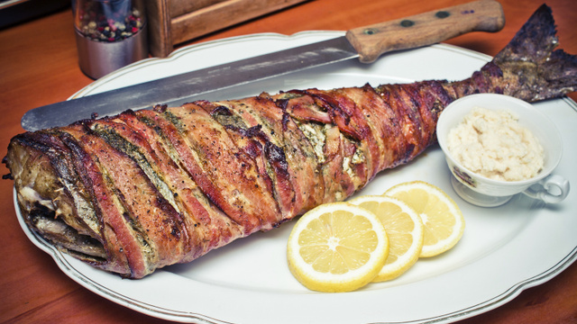 Un bar portion, agréablement parfumé d'estragon cuit dans des tranches de lard fumé. Un joli plat à partager !