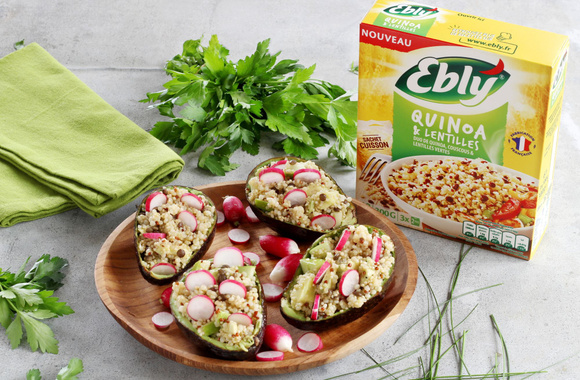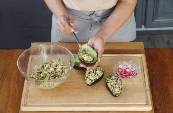 9Garnissez généreusement les coques d'avocat avec la préparation au Quinoa & Lentilles. Décorez avec les rondelles de radis.