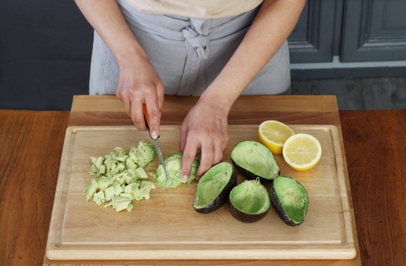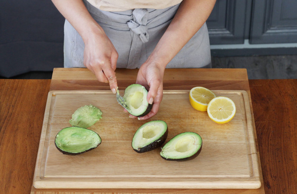 4Coupez les avocats en deux, retirez les noyaux et prélevez la chair de chaque demi-avocat en prenant soin de conserver une petite épaisseur.