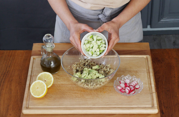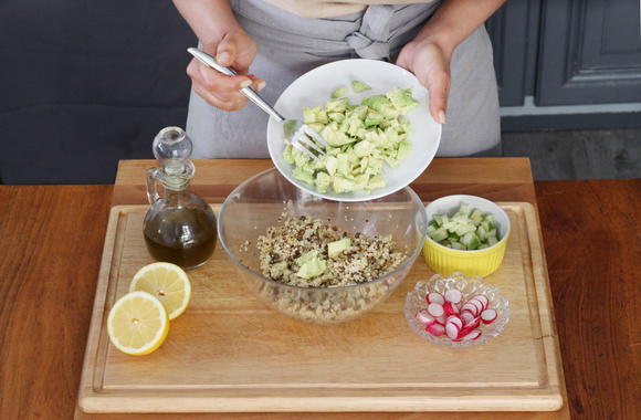 6Mettez le Quinoa & Lentilles dans un saladier, ajoutez les dés d'avocat.