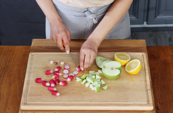 3Coupez la pomme en petits dés et les radis en fines rondelles.