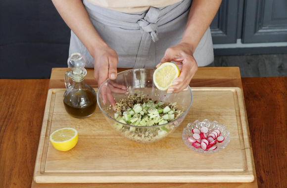 8Arrosez avec le jus de citron, puis ajoutez l'huile d'olive, le sel et le poivre. Mélangez.