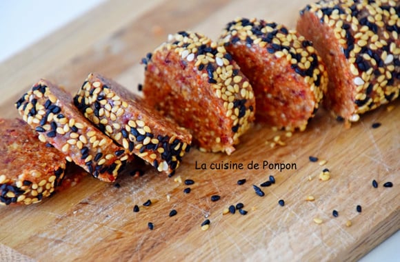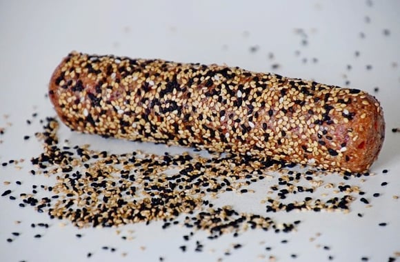 2Débarrasser sur le plan de travail et rassembler en un boudin de la dimension souhaitée. Rouler le boudin dans les graines de nigelle et de sésame et filmer le tout.