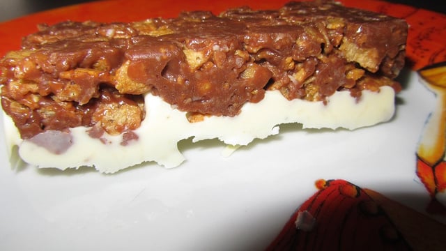 Mettre au frais pendant 30 minutes. Faire fondre le chocolat blanc au bain-marie et recouvrir le dessus des barres de céréales.