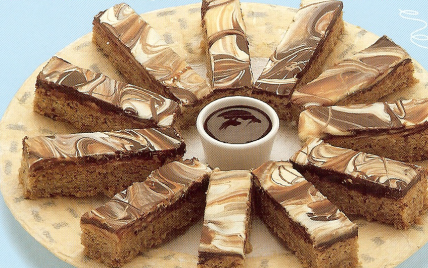 Sur le biscuit, déposez en alternant de grosses cuillères de chocolat au lait en de chocolat blanc.
