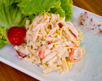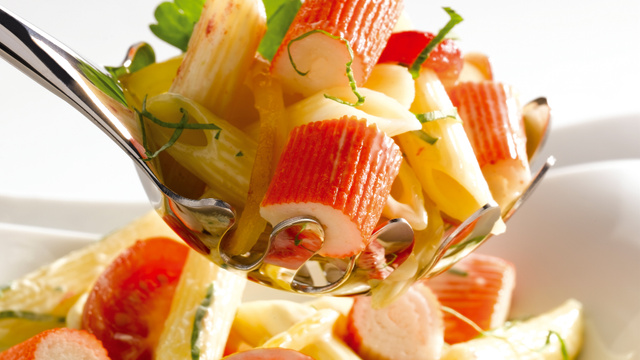 Assaisonner les pâtes avec la sauce et ajouter tous les ingrédients ainsi que les bâtonnets Saveur.