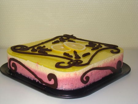 Une mousse au citron et une mousse aux framboises sur une génoise framboisée, un délice !
