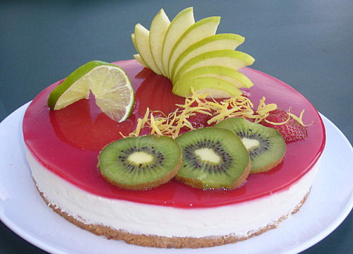 L'ajouter à la purée de framboises sucrée puis verser le tout délicatement sur le bavarois et remettre au frais au moins 2 heures voir toute la nuit. - 4Ensuite, vous pouvez passer à la décoration si vous le souhaitez.1/2 pomme, 2 fraises, 1 tranche de citron, 3 de kiwi et des zestes de citron.