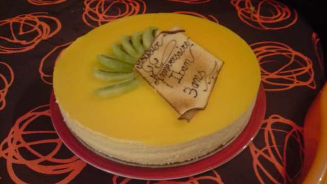 Léger bavarois à la mangue sur une génoise à la noisette.