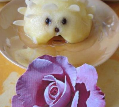 Verser la gelée sur les pommes et décorer avec des amandes effilées pour imiter les piquants du hérisson. Et vous pouvez faire les yeux et le nez avec des perles (Vahiné Croc' goût 3 chocos) et j'ai pris les chocolats pour ressortir les couleurs.