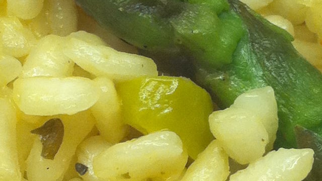 Faire revenir 2 échalotes dans du beurre. Y ajouter les blancs tendres d'une botte d'asperges en petits morceaux et faire cuire à feu doux 5 petites minutes. Verser 350g de riz Arborio et 15 cl de vin blanc.