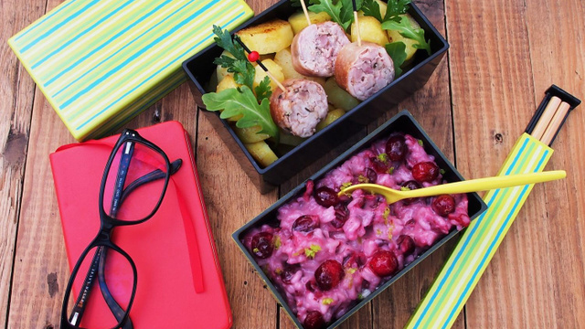 Il y a peu j'ai reçu de 750 grammes un Bento et la mission de préparer le repas qui va avec. Plusieurs copinautes ont eu la même mission, dans le cadre de la semaine du goût. Et beaucoup de monde a joué le jeu façon nipponne c'est à dire avec pour ingrédient principal le riz. Je suis fan de riz mais pour faire un clin d'oeil rigolo et pour changer j'ai joué à préparer un "Bento Bistrot", frenchie à fond, plein de goût, et même un brin canaille... J'espère juste du coup n'être pas hors sujet. Mais je me suis bien amusée et régalée aussi. Le principe de la lunch box reste classique... Souvent le Bento est préparé avec les restes du dîner de la veille : des andouillettes et des pommes de terre, qui ont fini en vinaigrette pour le déjeuner, et un riz au lait un brin acidulé, façon Tonka, cranberries fraîches et combawa... Pour la Semaine du goût j'ai voulu ce Bento riche en saveurs et textures.On y retrouve le salé (les pommes de terre), le sucré (le riz au lait), l'acide (les cranberries fraîches), l'épicé (les andouillettes), la découverte (le Combawa, la Tonka), de la douceur (le riz, les pommes de terre), du croquant (les baies roses des pommes de terre), du consistant et du frais (les cranberries juteuses éclatent sous la dent), et on trouve des féculents, de la viande, des légumes, des fruits... Ce n'est pas parce qu'on mange au boulot qu'on doit faire des concessions...