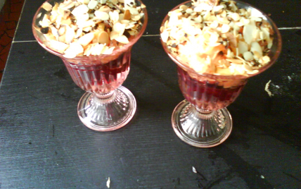 Préparez 2 coupes en disposant les lamelles de betteraves et les quartiers de fruits bien égouttés.Arrosez de vinaigrette et parsemez d'amande effilées.