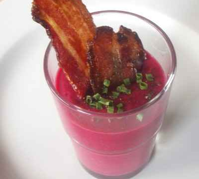 4/ Servir la soupe dans un verre transparent et y planter le lard.
