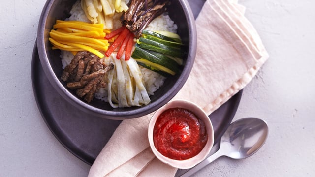 Le Bibimbap est un plat mêlant du riz nature, des légumes appelés « mamuls », de la viande de bœuf, et de la pâte de piment sautée. On dit que ce plat tire son origine des coutumes de cultures ancestrales et rurales pratiquées dans les villages.