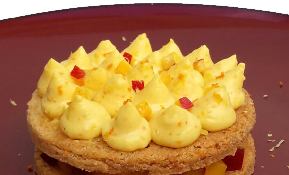 Sablé coco accompagné de fruits frais et d'une crème aux kumquats.